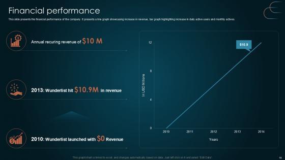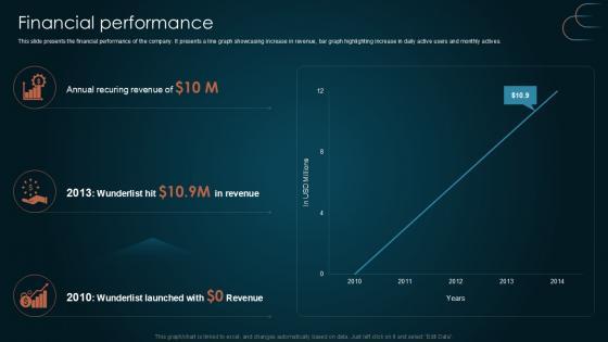This slide presents the financial performance of the company. It presents a line graph showcasing increase in revenue, bar graph highlighting increase in daily active users and monthly actives. There are so many reasons you need a Financial Performance Team Collaboration Platform Pitch Deck PPT Template. The first reason is you can not spend time making everything from scratch, Thus, Slidegeeks has made presentation templates for you too. You can easily download these templates from our website easily. This slide presents the financial performance of the company. It presents a line graph showcasing increase in revenue, bar graph highlighting increase in daily active users and monthly actives.