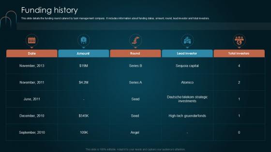 Get a simple yet stunning designed Funding History Team Collaboration Platform Pitch Deck PPT PowerPoint. It is the best one to establish the tone in your meetings. It is an excellent way to make your presentations highly effective. So, download this PPT today from Slidegeeks and see the positive impacts. Our easy-to-edit Funding History Team Collaboration Platform Pitch Deck PPT PowerPoint can be your go-to option for all upcoming conferences and meetings. So, what are you waiting for Grab this template today. Our Funding History Team Collaboration Platform Pitch Deck PPT PowerPoint are topically designed to provide an attractive backdrop to any subject. Use them to look like a presentation pro.