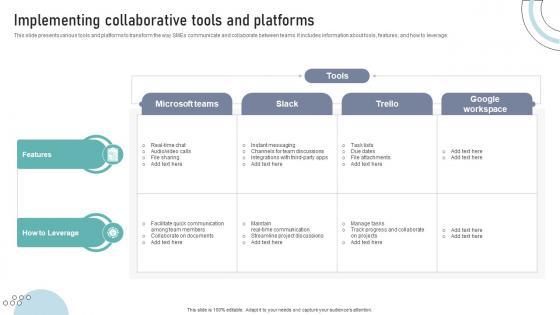 This slide presents various tools and platforms to transform the way SMEs communicate and collaborate between teams. It includes information about tools, features, and how to leverage.Find a pre-designed and impeccable Implementing Collaborative Tools And Platforms DT SS V. The templates can ace your presentation without additional effort. You can download these easy-to-edit presentation templates to make your presentation stand out from others. So, what are you waiting for Download the template from Slidegeeks today and give a unique touch to your presentation. This slide presents various tools and platforms to transform the way SMEs communicate and collaborate between teams. It includes information about tools, features, and how to leverage.