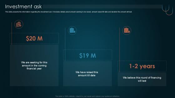 This slide presents the information regarding the investment ask. It includes details about amount seeking to be raised, amount raised till date and duration the amount will last. Present like a pro with Investment Ask Team Collaboration Platform Pitch Deck PPT Example. Create beautiful presentations together with your team, using our easy-to-use presentation slides. Share your ideas in real-time and make changes on the fly by downloading our templates. So whether you are in the office, on the go, or in a remote location, you can stay in sync with your team and present your ideas with confidence. With Slidegeeks presentation got a whole lot easier. Grab these presentations today. This slide presents the information regarding the investment ask. It includes details about amount seeking to be raised, amount raised till date and duration the amount will last.