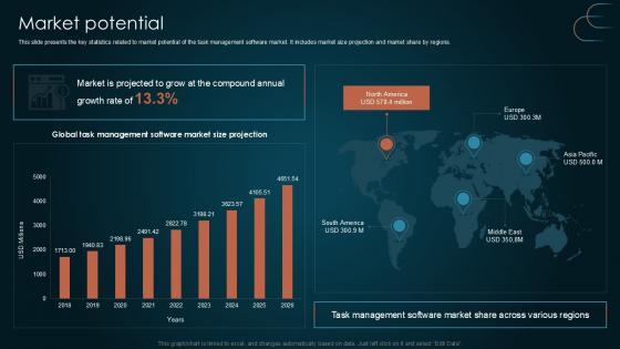 This slide presents the key statistics related to market potential of the task management software market. It includes market size projection and market share by regions. Whether you have daily or monthly meetings, a brilliant presentation is necessary. Market Potential Team Collaboration Platform Pitch Deck PPT PowerPoint can be your best option for delivering a presentation. Represent everything in detail using Market Potential Team Collaboration Platform Pitch Deck PPT PowerPoint and make yourself stand out in meetings. The template is versatile and follows a structure that will cater to your requirements. All the templates prepared by Slidegeeks are easy to download and edit. Our research experts have taken care of the corporate themes as well. So, give it a try and see the results. This slide presents the key statistics related to market potential of the task management software market. It includes market size projection and market share by regions.