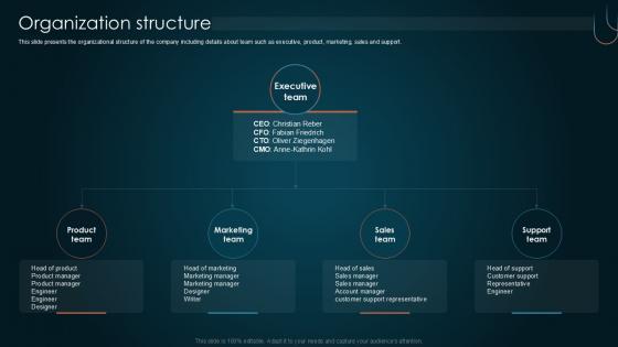 This slide presents the organizational structure of the company including details about team such as executive, product, marketing, sales and support. Find highly impressive Organization Structure Team Collaboration Platform Pitch Deck PPT Sample on Slidegeeks to deliver a meaningful presentation. You can save an ample amount of time using these presentation templates. No need to worry to prepare everything from scratch because Slidegeeks experts have already done a huge research and work for you. You need to download Organization Structure Team Collaboration Platform Pitch Deck PPT Sample for your upcoming presentation. All the presentation templates are 100 percent editable and you can change the color and personalize the content accordingly. Download now This slide presents the organizational structure of the company including details about team such as executive, product, marketing, sales and support.