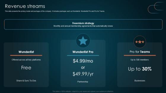 This slide presents the pricing model and packages of the company. It includes packages such as Wunderlist, Wunderlist Pro and Pro for Teams. Crafting an eye-catching presentation has never been more straightforward. Let your presentation shine with this tasteful yet straightforward Revenue Streams Team Collaboration Platform Pitch Deck PPT Slide template. It offers a minimalistic and classy look that is great for making a statement. The colors have been employed intelligently to add a bit of playfulness while still remaining professional. Construct the ideal Revenue Streams Team Collaboration Platform Pitch Deck PPT Slide that effortlessly grabs the attention of your audience Begin now and be certain to wow your customers This slide presents the pricing model and packages of the company. It includes packages such as Wunderlist, Wunderlist Pro and Pro for Teams.