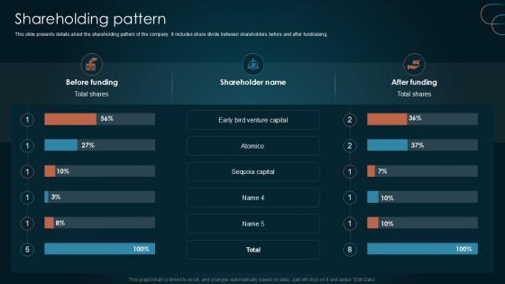 This slide presents details about the shareholding pattern of the company. It includes share divide between shareholders before and after fundraising. Make sure to capture your audiences attention in your business displays with our gratis customizable Shareholding Pattern Team Collaboration Platform Pitch Deck PPT Presentation. These are great for business strategies, office conferences, capital raising or task suggestions. If you desire to acquire more customers for your tech business and ensure they stay satisfied, create your own sales presentation with these plain slides. This slide presents details about the shareholding pattern of the company. It includes share divide between shareholders before and after fundraising.