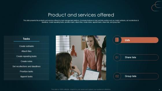This slide presents the products and services offered by task management platform. It includes features in task and lists section such as create subtasks, set recollections and deadlines, create repeating tasks, prioritize tasks, attach files, create notes, appoint tasks, share lists, and group lists. Are you in need of a template that can accommodate all of your creative concepts This one is crafted professionally and can be altered to fit any style. Use it with Google Slides or PowerPoint. Include striking photographs, symbols, depictions, and other visuals. Fill, move around, or remove text boxes as desired. Test out color palettes and font mixtures. Edit and save your work, or work with colleagues. Download Product And Services Offered Team Collaboration Platform Pitch Deck PPT Presentation and observe how to make your presentation outstanding. Give an impeccable presentation to your group and make your presentation unforgettable. This slide presents the products and services offered by task management platform. It includes features in task and lists section such as create subtasks, set recollections and deadlines, create repeating tasks, prioritize tasks, attach files, create notes, appoint tasks, share lists, and group lists.