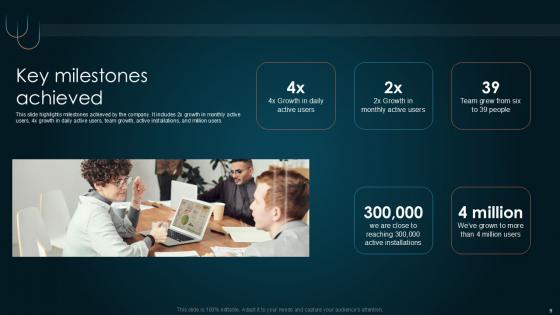 This slide highlights milestones achieved by the company. It includes 2x growth in monthly active users, 4x growth in daily active users, team growth, active installations, and million users. Do you have an important presentation coming up Are you looking for something that will make your presentation stand out from the rest Look no further than Key Milestones Achieved Team Collaboration Platform Pitch Deck PPT Template. With our professional designs, you can trust that your presentation will pop and make delivering it a smooth process. And with Slidegeeks, you can trust that your presentation will be unique and memorable. So why wait Grab Key Milestones Achieved Team Collaboration Platform Pitch Deck PPT Template today and make your presentation stand out from the rest This slide highlights milestones achieved by the company. It includes 2x growth in monthly active users, 4x growth in daily active users, team growth, active installations, and million users.