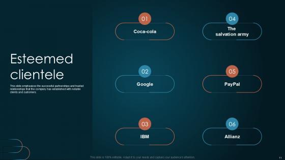This slide emphasizes the successful partnerships and trusted relationships that the company has established with notable clients and customers. Slidegeeks is one of the best resources for PowerPoint templates. You can download easily and regulate Esteemed Clientele Team Collaboration Platform Pitch Deck PPT PowerPoint for your personal presentations from our wonderful collection. A few clicks is all it takes to discover and get the most relevant and appropriate templates. Use our Templates to add a unique zing and appeal to your presentation and meetings. All the slides are easy to edit and you can use them even for advertisement purposes. This slide emphasizes the successful partnerships and trusted relationships that the company has established with notable clients and customers.
