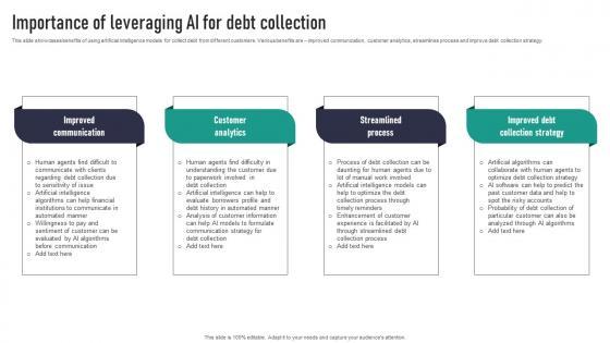 This slide showcases benefits of using artificial intelligence models for collect debt from different customers. Various benefits are improved communication, customer analytics, streamlines process and improve debt collection strategy.The Importance Of Leveraging Ai For Debt Collection Artificial Intelligence Applications Ideas Pdf is a compilation of the most recent design trends as a series of slides. It is suitable for any subject or industry presentation, containing attractive visuals and photo spots for businesses to clearly express their messages. This template contains a variety of slides for the user to input data, such as structures to contrast two elements, bullet points, and slides for written information. Slidegeeks is prepared to create an impression. This slide showcases benefits of using artificial intelligence models for collect debt from different customers. Various benefits are improved communication, customer analytics, streamlines process and improve debt collection strategy.