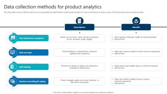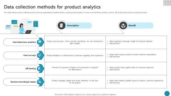 This slide outlines various methods used by business organisations to gather data for conduct product analytics. It covers user behaviour analytics, surveys, A or B testing with session recording and replay.Crafting an eye-catching presentation has never been more straightforward. Let your presentation shine with this tasteful yet straightforward Data Collection Methods For Product Analytics Product Analytics Implementation Data Analytics V template. It offers a minimalistic and classy look that is great for making a statement. The colors have been employed intelligently to add a bit of playfulness while still remaining professional. Construct the ideal Data Collection Methods For Product Analytics Product Analytics Implementation Data Analytics V that effortlessly grabs the attention of your audience Begin now and be certain to wow your customers This slide outlines various methods used by business organisations to gather data for conduct product analytics. It covers user behaviour analytics, surveys, A or B testing with session recording and replay.
