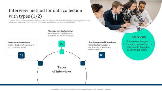 This slide outlines brief introduction of interview method for collecting data in market intelligence. It highlights various types of interviews such as structured interviews, unstructured interviews and semi structured interviews. Welcome to our selection of the Guidebook For Executing Business Market Intelligence Interview Method For Data Collection Graphics PDF. These are designed to help you showcase your creativity and bring your sphere to life. Planning and Innovation are essential for any business that is just starting out. This collection contains the designs that you need for your everyday presentations. All of our PowerPoints are 100 percent editable, so you can customize them to suit your needs. This multi purpose template can be used in various situations. Grab these presentation templates today.