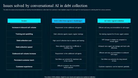 This slide showcases various issues that can faced by financial institutions to collect debt from customers. It also highlights usage of AI voice agent for resolving issues for collecting debt from various customers.Retrieve professionally designed Issues Solved By Conversational Ai In Debt Collection Artificial Intelligence Applications Formats Pdf to effectively convey your message and captivate your listeners. Save time by selecting pre-made slideshows that are appropriate for various topics, from business to educational purposes. These themes come in many different styles, from creative to corporate, and all of them are easily adjustable and can be edited quickly. Access them as PowerPoint templates or as Google Slides themes. You do not have to go on a hunt for the perfect presentation because Slidegeeks got you covered from everywhere. This slide showcases various issues that can faced by financial institutions to collect debt from customers. It also highlights usage of AI voice agent for resolving issues for collecting debt from various customers.