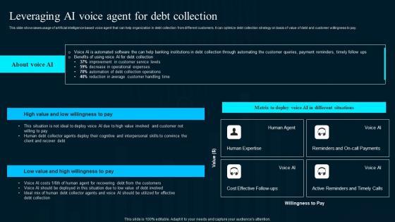 This slide showcases usage of artificial intelligence based voice agent that can help organization in debt collection from different customers. It can optimize debt collection strategy on basis of value of debt and customer willingness to pay.Take your projects to the next level with our ultimate collection of Leveraging Ai Voice Agent For Debt Collection Artificial Intelligence Applications Clipart Pdf. Slidegeeks has designed a range of layouts that are perfect for representing task or activity duration, keeping track of all your deadlines at a glance. Tailor these designs to your exact needs and give them a truly corporate look with your own brand colors they all make your projects stand out from the rest. This slide showcases usage of artificial intelligence based voice agent that can help organization in debt collection from different customers. It can optimize debt collection strategy on basis of value of debt and customer willingness to pay.