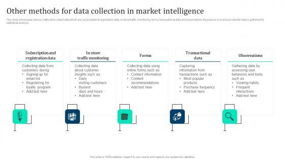 This slide showcases various methods to collect data which are subscription registration data, in store traffic monitoring, forms, transactional data and observations. Its purpose is to ensure reliable data is gathered for statistical analysis. This Strategic Market Insight Implementation Guide Other Methods For Data Collection In Market Intelligence Designs PDF from Slidegeeks makes it easy to present information on your topic with precision. It provides customization options, so you can make changes to the colors, design, graphics, or any other component to create a unique layout. It is also available for immediate download, so you can begin using it right away. Slidegeeks has done good research to ensure that you have everything you need to make your presentation stand out. Make a name out there for a brilliant performance.