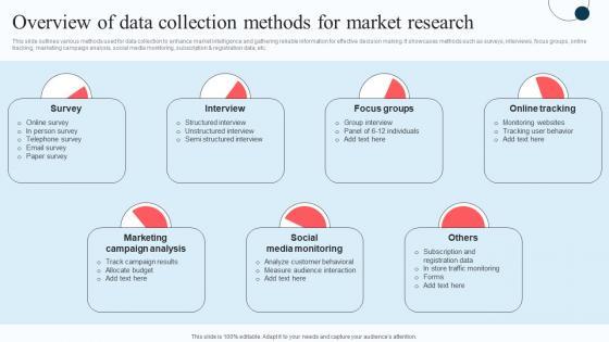 This slide outlines various methods used for data collection to enhance market intelligence and gathering reliable information for effective decision making. It showcases methods such as surveys, interviews, focus groups, online tracking, marketing campaign analysis, social media monitoring, subscription and registration data, etc. Coming up with a presentation necessitates that the majority of the effort goes into the content and the message you intend to convey. The visuals of a PowerPoint presentation can only be effective if it supplements and supports the story that is being told. Keeping this in mind our experts created Competitive Intelligence Guide To Determine Market Overview Of Data Collection Sample Pdf to reduce the time that goes into designing the presentation. This way, you can concentrate on the message while our designers take care of providing you with the right template for the situation. This slide outlines various methods used for data collection to enhance market intelligence and gathering reliable information for effective decision making. It showcases methods such as surveys, interviews, focus groups, online tracking, marketing campaign analysis, social media monitoring, subscription and registration data, etc.
