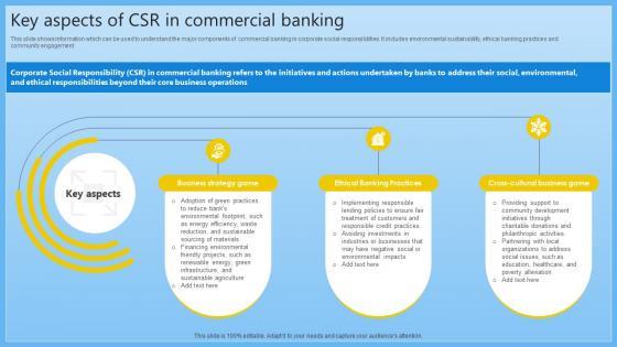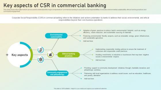 This slide shows information which can be used to understand the major components of commercial banking in corporate social responsibilities. It includes environmental sustainability, ethical banking practices and community engagement. This Key Aspects Of CSR In Commercial Banking Complete Guide On Managing Banking Fin SS V from Slidegeeks makes it easy to present information on your topic with precision. It provides customization options, so you can make changes to the colors, design, graphics, or any other component to create a unique layout. It is also available for immediate download, so you can begin using it right away. Slidegeeks has done good research to ensure that you have everything you need to make your presentation stand out. Make a name out there for a brilliant performance. This slide shows information which can be used to understand the major components of commercial banking in corporate social responsibilities. It includes environmental sustainability, ethical banking practices and community engagement.
