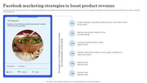 The following slide outlines various facebook marketing strategies which can assist the companies to increase the sales of new product. The strategies highlighted in the slide are uploading quality pictures and videos, adding the product details etc. Find highly impressive Launching New Commodity Facebook Marketing Strategies To Boost Product Revenue Information Pdf on Slidegeeks to deliver a meaningful presentation. You can save an ample amount of time using these presentation templates. No need to worry to prepare everything from scratch because Slidegeeks experts have already done a huge research and work for you. You need to download Launching New Commodity Facebook Marketing Strategies To Boost Product Revenue Information Pdf for your upcoming presentation. All the presentation templates are 100 percent editable and you can change the color and personalize the content accordingly. Download now The following slide outlines various facebook marketing strategies which can assist the companies to increase the sales of new product. The strategies highlighted in the slide are uploading quality pictures and videos, adding the product details etc.
