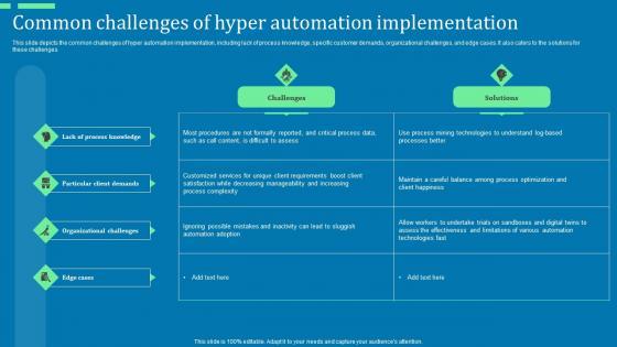 This slide depicts the common challenges of hyper automation implementation, including lack of process knowledge, specific customer demands, organizational challenges, and edge cases. It also caters to the solutions for these challenges. Whether you have daily or monthly meetings, a brilliant presentation is necessary. Common Challenges Of Hyper Automation Implementation Ppt Ideas Icons Pdf can be your best option for delivering a presentation. Represent everything in detail using Common Challenges Of Hyper Automation Implementation Ppt Ideas Icons Pdf and make yourself stand out in meetings. The template is versatile and follows a structure that will cater to your requirements. All the templates prepared by Slidegeeks are easy to download and edit. Our research experts have taken care of the corporate themes as well. So, give it a try and see the results. This slide depicts the common challenges of hyper automation implementation, including lack of process knowledge, specific customer demands, organizational challenges, and edge cases. It also caters to the solutions for these challenges.