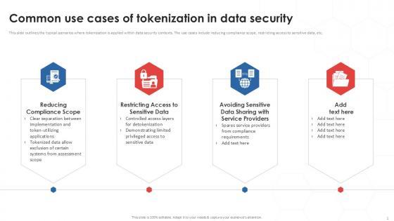 This slide outlines the typical scenarios where tokenization is applied within data security contexts. The use cases include reducing compliance scope, restricting access to sensitive data, etc. Find a pre-designed and impeccable Common Use Cases Of Tokenization In Data Security PPT Template. The templates can ace your presentation without additional effort. You can download these easy-to-edit presentation templates to make your presentation stand out from others. So, what are you waiting for Download the template from Slidegeeks today and give a unique touch to your presentation. This slide outlines the typical scenarios where tokenization is applied within data security contexts. The use cases include reducing compliance scope, restricting access to sensitive data, etc.