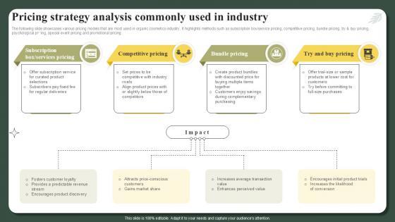 The following slide showcases various pricing models that are most used in organic cosmetics industry. It highlights methods such as subscription box service pricing, competitive pricing, bundle pricing, try and buy pricing, psychological pricing, special event pricing and promotional pricing. Slidegeeks is here to make your presentations a breeze with Pricing Strategy Analysis Commonly Used In Industry Successful Launch Ppt Presentation With our easy-to-use and customizable templates, you can focus on delivering your ideas rather than worrying about formatting. With a variety of designs to choose from, you are sure to find one that suits your needs. And with animations and unique photos, illustrations, and fonts, you can make your presentation pop. So whether you are giving a sales pitch or presenting to the board, make sure to check out Slidegeeks first The following slide showcases various pricing models that are most used in organic cosmetics industry. It highlights methods such as subscription box service pricing, competitive pricing, bundle pricing, try and buy pricing, psychological pricing, special event pricing and promotional pricing.