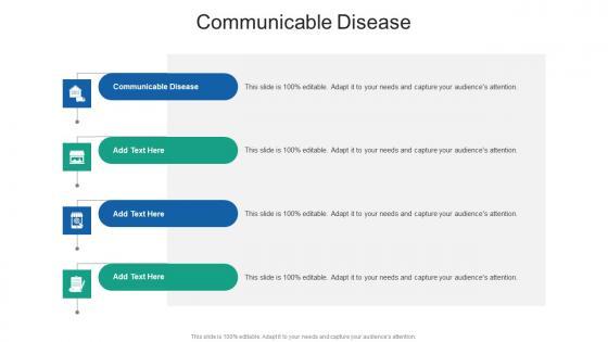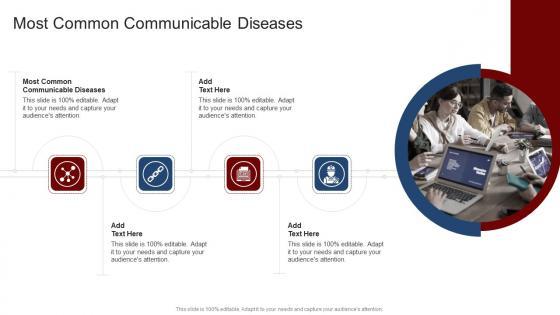 Introducing our well designed Most Common Communicable Diseases In Powerpoint And Google Slides Cpb. This PowerPoint design presents information on topics like Most Common Communicable Diseases. As it is predesigned it helps boost your confidence level. It also makes you a better presenter because of its high-quality content and graphics. This PPT layout can be downloaded and used in different formats like PDF, PNG, and JPG. Not only this, it is available in both Standard Screen and Widescreen aspect ratios for your convenience. Therefore, click on the download button now to persuade and impress your audience. Our Most Common Communicable Diseases In Powerpoint And Google Slides Cpb are topically designed to provide an attractive backdrop to any subject. Use them to look like a presentation pro.