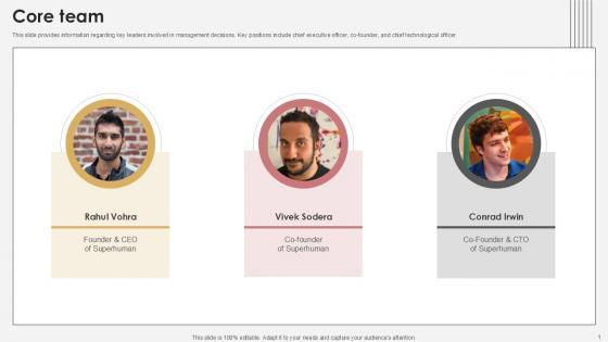 This slide provides information regarding key leaders involved in management decisions. Key positions include chief executive officer, co-founder, and chief technological officer. Do you have to make sure that everyone on your team knows about any specific topic I yes, then you should give Core Team Communication Tech Company Pitch Deck PPT PowerPoint a try. Our experts have put a lot of knowledge and effort into creating this impeccable Core Team Communication Tech Company Pitch Deck PPT PowerPoint. You can use this template for your upcoming presentations, as the slides are perfect to represent even the tiniest detail. You can download these templates from the Slidegeeks website and these are easy to edit. So grab these today This slide provides information regarding key leaders involved in management decisions. Key positions include chief executive officer, co-founder, and chief technological officer.