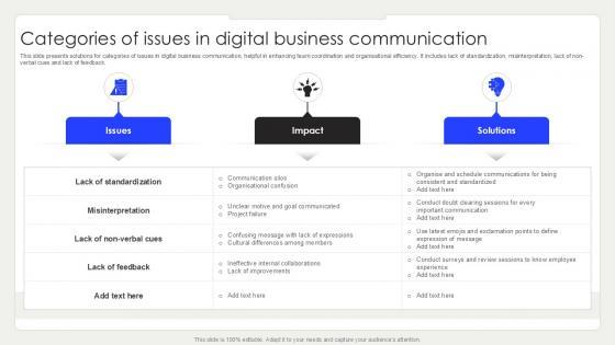 This slide presents solutions for categories of issues in digital business communication, helpful in enhancing team coordination and organisational efficiency. It includes lack of standardization, misinterpretation, lack of non-verbal cues and lack of feedback. Are you searching for a Categories Of Issues In Digital Business Communication PPT Slide SS that is uncluttered, straightforward, and original Its easy to edit, and you can change the colors to suit your personal or business branding. For a presentation that expresses how much effort you have put in, this template is ideal With all of its features, including tables, diagrams, statistics, and lists, its perfect for a business plan presentation. Make your ideas more appealing with these professional slides. Download Categories Of Issues In Digital Business Communication PPT Slide SS from Slidegeeks today. This slide presents solutions for categories of issues in digital business communication, helpful in enhancing team coordination and organisational efficiency. It includes lack of standardization, misinterpretation, lack of non-verbal cues and lack of feedback.