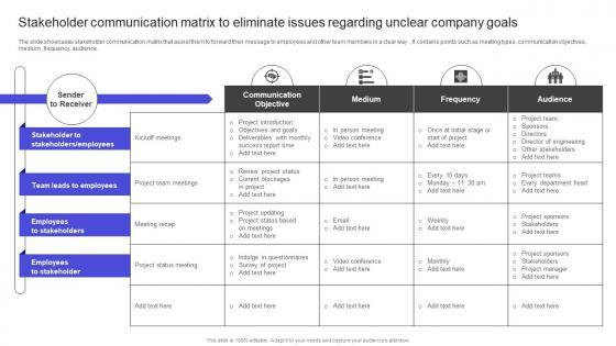 The slide showcases stakeholder communication matrix that assist them to forward their message to employees and other team members in a clear way . It contains points such as meeting types, communication objectives, medium , frequency, audience . From laying roadmaps to briefing everything in detail, our templates are perfect for you. You can set the stage with your presentation slides. All you have to do is download these easy-to-edit and customizable templates. Strategies To Build Meaningful Stakeholder Communication Matrix To Eliminate Issues Regarding Template Pdf will help you deliver an outstanding performance that everyone would remember and praise you for. Do download this presentation today. The slide showcases stakeholder communication matrix that assist them to forward their message to employees and other team members in a clear way . It contains points such as meeting types, communication objectives, medium , frequency, audience .