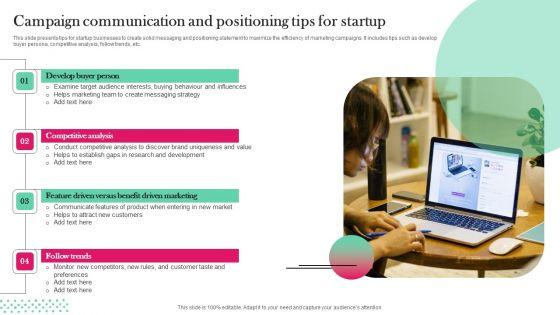 This slide presents tips for startup businesses to create solid messaging and positioning statement to maximize the efficiency of marketing campaigns. It includes tips such as develop buyer persona, competitive analysis, follow trends, etc. Persuade your audience using this Campaign Communication And Positioning Tips For Startup Download PDF. This PPT design covers four stages, thus making it a great tool to use. It also caters to a variety of topics including Develop Buyer Person, Competitive Analysis, Feature Driven Versus, Benefit Driven Marketing, Follow Trends. Download this PPT design now to present a convincing pitch that not only emphasizes the topic but also showcases your presentation skills.