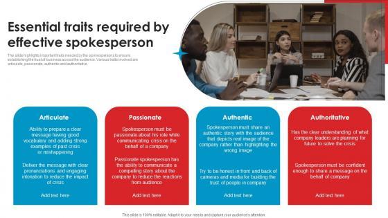The slide highlights important traits needed by the spokespersons to ensure establishing the trust of business across the audience. Various traits involved are articulate, passionate, authentic and authoritative Do you have to make sure that everyone on your team knows about any specific topic I yes, then you should give Essential Traits Required Effective Strategic Guide Crisis Communication Planning Professional Pdf a try. Our experts have put a lot of knowledge and effort into creating this impeccable Essential Traits Required Effective Strategic Guide Crisis Communication Planning Professional Pdf. You can use this template for your upcoming presentations, as the slides are perfect to represent even the tiniest detail. You can download these templates from the Slidegeeks website and these are easy to edit. So grab these today The slide highlights important traits needed by the spokespersons to ensure establishing the trust of business across the audience. Various traits involved are articulate, passionate, authentic and authoritative