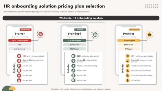 Mentioned slide provides information about pricing plan selection based on pricing, employees managed, and included features. Make sure to capture your audiences attention in your business displays with our gratis customizable Automated Communication System HR Onboarding Solution Pricing Plan Selection. These are great for business strategies, office conferences, capital raising or task suggestions. If you desire to acquire more customers for your tech business and ensure they stay satisfied, create your own sales presentation with these plain slides. Mentioned slide provides information about pricing plan selection based on pricing, employees managed, and included features.