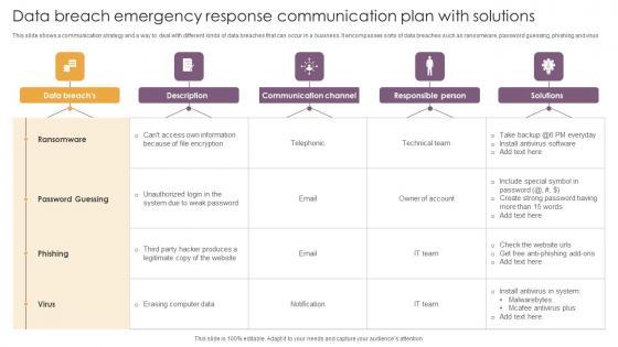 This slide shows a communication strategy and a way to deal with different kinds of data breaches that can occur in a business. It encompasses sorts of data breaches such as ransomware, password guessing, phishing and virus Showcasing this set of slides titled Data Breach Emergency Response Communication Plan With Solutions Introduction Pdf The topics addressed in these templates are Ransomware, Password Guessing, Communication Channel All the content presented in this PPT design is completely editable. Download it and make adjustments in color, background, font etc. as per your unique business setting. This slide shows a communication strategy and a way to deal with different kinds of data breaches that can occur in a business. It encompasses sorts of data breaches such as ransomware, password guessing, phishing and virus