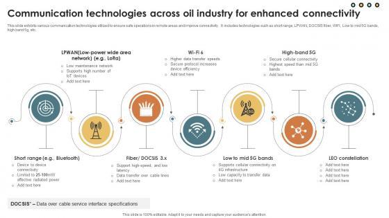 This slide exhibits various communication technologies utilized to ensure safe operations in remote areas and improve connectivity. It includes technologies such as short range, LPWAN, DOCSIS fiber, WIFI, Low to mid 5G bands, high band 5g, etc. Whether you have daily or monthly meetings, a brilliant presentation is necessary. IoT Solutions For Oil Communication Technologies Across Oil Industry For Enhanced IoT SS V can be your best option for delivering a presentation. Represent everything in detail using IoT Solutions For Oil Communication Technologies Across Oil Industry For Enhanced IoT SS V and make yourself stand out in meetings. The template is versatile and follows a structure that will cater to your requirements. All the templates prepared by Slidegeeks are easy to download and edit. Our research experts have taken care of the corporate themes as well. So, give it a try and see the results. This slide exhibits various communication technologies utilized to ensure safe operations in remote areas and improve connectivity. It includes technologies such as short range, LPWAN, DOCSIS fiber, WIFI, Low to mid 5G bands, high band 5g, etc.