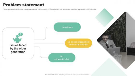 Following slide provides information about problems faced by older community. It includes problems such as loneliness, no social engagement and no companionship. From laying roadmaps to briefing everything in detail, our templates are perfect for you. You can set the stage with your presentation slides. All you have to do is download these easy to edit and customizable templates. Problem Statement Social Community Management Solution Funding Pitch Presentation Infographics Pdf will help you deliver an outstanding performance that everyone would remember and praise you for. Do download this presentation today. Following slide provides information about problems faced by older community. It includes problems such as loneliness, no social engagement and no companionship.