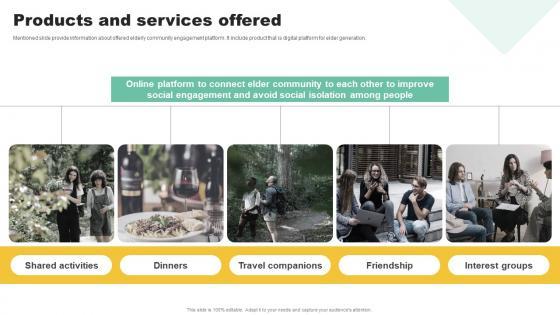 Mentioned slide provide information about offered elderly community engagement platform. It include product that is digital platform for elder generation. Present like a pro with Products And Services Offered Social Community Management Solution Funding Pitch Professional Pdf Create beautiful presentations together with your team, using our easy to use presentation slides. Share your ideas in real time and make changes on the fly by downloading our templates. So whether you are in the office, on the go, or in a remote location, you can stay in sync with your team and present your ideas with confidence. With Slidegeeks presentation got a whole lot easier. Grab these presentations today. Mentioned slide provide information about offered elderly community engagement platform. It include product that is digital platform for elder generation.