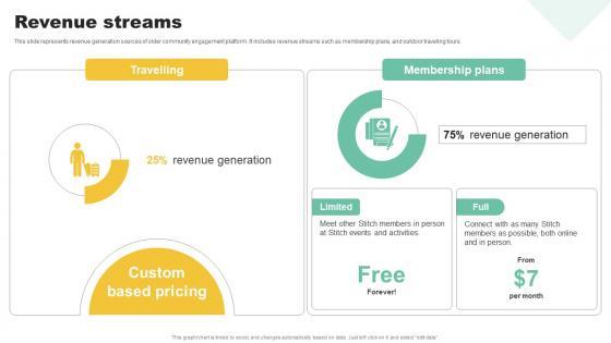 This slide represents revenue generation sources of older community engagement platform. It includes revenue streams such as membership plans, and outdoor traveling tours. Slidegeeks is here to make your presentations a breeze with Revenue Streams Social Community Management Solution Funding Pitch Presentation Background Pdf With our easy to use and customizable templates, you can focus on delivering your ideas rather than worrying about formatting. With a variety of designs to choose from, you are sure to find one that suits your needs. And with animations and unique photos, illustrations, and fonts, you can make your presentation pop. So whether you are giving a sales pitch or presenting to the board, make sure to check out Slidegeeks first This slide represents revenue generation sources of older community engagement platform. It includes revenue streams such as membership plans, and outdoor traveling tours.
