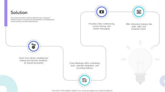 This slide provide the solutions offered by the company to address issues. It includes real-time feedback, scheduling tools, screen sharing, and interactive features. If your project calls for a presentation, then Slidegeeks is your go-to partner because we have professionally designed, easy-to-edit templates that are perfect for any presentation. After downloading, you can easily edit Solution Cloud Communication Company Business Model BMC SS V and make the changes accordingly. You can rearrange slides or fill them with different images. Check out all the handy templates This slide provide the solutions offered by the company to address issues. It includes real-time feedback, scheduling tools, screen sharing, and interactive features.