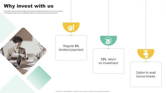 Following slide provides insights into reasons to attract investors to invest in business. It includes reasons such as dividend, return on investment, and bonus shares. If your project calls for a presentation, then Slidegeeks is your go to partner because we have professionally designed, easy to edit templates that are perfect for any presentation. After downloading, you can easily edit Why Invest With Us Social Community Management Solution Funding Pitch Presentation Pictures Pdf and make the changes accordingly. You can rearrange slides or fill them with different images. Check out all the handy templates Following slide provides insights into reasons to attract investors to invest in business. It includes reasons such as dividend, return on investment, and bonus shares.