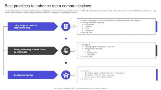 The slide showcases best practices used by managers for better team communication in organizations . Purpose of slide is to implement best practices to extract better work outcomes from team. It contains points such as using project charter for efficient working , timely monitoring of work done by employees , conducting meetings etc. Boost your pitch with our creative Strategies To Build Meaningful Best Practices To Enhance Team Communications Template PDF Deliver an awe-inspiring pitch that will mesmerize everyone. Using these presentation templates you will surely catch everyones attention. You can browse the ppts collection on our website. We have researchers who are experts at creating the right content for the templates. So you do not have to invest time in any additional work. Just grab the template now and use them. The slide showcases best practices used by managers for better team communication in organizations . Purpose of slide is to implement best practices to extract better work outcomes from team. It contains points such as using project charter for efficient working , timely monitoring of work done by employees , conducting meetings etc.