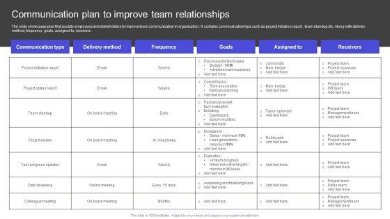 The slide showcases plan that assists employees and stakeholders to improve team communication in organization . It contains communication type such as project initiation report , team standup etc. Along with delivery method, frequency, goals, assigned to, receivers . There are so many reasons you need a Strategies To Build Meaningful Communication Plan To Improve Team Relationships Topics PDF The first reason is you can not spend time making everything from scratch, Thus, Slidegeeks has made presentation templates for you too. You can easily download these templates from our website easily. The slide showcases plan that assists employees and stakeholders to improve team communication in organization . It contains communication type such as project initiation report , team standup etc. Along with delivery method, frequency, goals, assigned to, receivers .