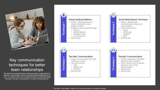 The slide showcases techniques used by manager in organizations for effective communication in teams and better understanding work to be done . It contains points such as feedback method, social media based technique , two way communication , osmotic communication etc. Welcome to our selection of the Strategies To Build Meaningful Key Communication Techniques For Better Team Relationships Mockup PDF These are designed to help you showcase your creativity and bring your sphere to life. Planning and Innovation are essential for any business that is just starting out. This collection contains the designs that you need for your everyday presentations. All of our PowerPoints are 100 percent editable, so you can customize them to suit your needs. This multi-purpose template can be used in various situations. Grab these presentation templates today The slide showcases techniques used by manager in organizations for effective communication in teams and better understanding work to be done . It contains points such as feedback method, social media based technique , two way communication , osmotic communication etc.