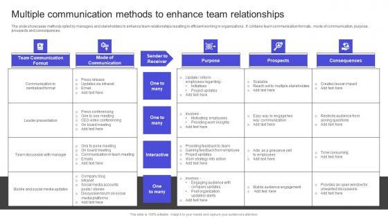 The slide showcases methods opted by managers and stakeholders to enhance team relationships resulting in efficient working in organizations . It contains team communication formats , mode of communication, purpose , prospects and consequences . The Strategies To Build Meaningful Multiple Communication Methods To Enhance Team Relationships Clipart PDF is a compilation of the most recent design trends as a series of slides. It is suitable for any subject or industry presentation, containing attractive visuals and photo spots for businesses to clearly express their messages. This template contains a variety of slides for the user to input data, such as structures to contrast two elements, bullet points, and slides for written information. Slidegeeks is prepared to create an impression. The slide showcases methods opted by managers and stakeholders to enhance team relationships resulting in efficient working in organizations . It contains team communication formats , mode of communication, purpose , prospects and consequences .