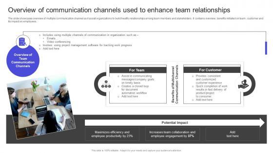 The slide showcases overview of multiple communication channel as it assist organizations to build healthy relationships among team members and stakeholders . It contains overview, benefits initiated on team , customer and its impact on employees. Are you searching for a Strategies To Build Meaningful Overview Of Communication Channels Used To Enhance Team Slides PDF that is uncluttered, straightforward, and original Its easy to edit, and you can change the colors to suit your personal or business branding. For a presentation that expresses how much effort you have put in, this template is ideal With all of its features, including tables, diagrams, statistics, and lists, its perfect for a business plan presentation. Make your ideas more appealing with these professional slides. Download Strategies To Build Meaningful Overview Of Communication Channels Used To Enhance Team Slides PDF from Slidegeeks today. The slide showcases overview of multiple communication channel as it assist organizations to build healthy relationships among team members and stakeholders . It contains overview, benefits initiated on team , customer and its impact on employees.