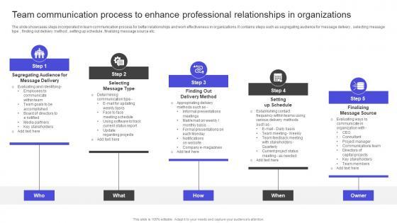 The slide showcases steps incorporated in team communication process for better relationships and work effectiveness in organizations. It contains steps such as segregating audience for message delivery , selecting message type , finding out delivery method , setting up schedule , finalizing message source etc. Are you in need of a template that can accommodate all of your creative concepts This one is crafted professionally and can be altered to fit any style. Use it with Google Slides or PowerPoint. Include striking photographs, symbols, depictions, and other visuals. Fill, move around, or remove text boxes as desired. Test out color palettes and font mixtures. Edit and save your work, or work with colleagues. Download Strategies To Build Meaningful Team Communication Process To Enhance Professional Graphics Pdf and observe how to make your presentation outstanding. Give an impeccable presentation to your group and make your presentation unforgettable. The slide showcases steps incorporated in team communication process for better relationships and work effectiveness in organizations. It contains steps such as segregating audience for message delivery , selecting message type , finding out delivery method , setting up schedule , finalizing message source etc.