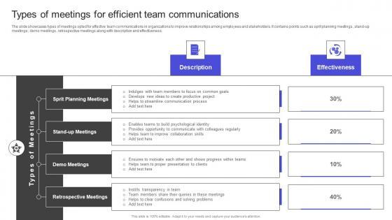 The slide showcases types of meetings opted for effective team communications in organizations to improve relationships among employees and stakeholders. It contains points such as sprit planning meetings , stand-up meetings , demo meetings , retrospective meetings along with description and effectiveness. Slidegeeks is here to make your presentations a breeze with Strategies To Build Meaningful Types Of Meetings For Efficient Team Communications Graphics PDF With our easy-to-use and customizable templates, you can focus on delivering your ideas rather than worrying about formatting. With a variety of designs to choose from, you are sure to find one that suits your needs. And with animations and unique photos, illustrations, and fonts, you can make your presentation pop. So whether you are giving a sales pitch or presenting to the board, make sure to check out Slidegeeks first The slide showcases types of meetings opted for effective team communications in organizations to improve relationships among employees and stakeholders. It contains points such as sprit planning meetings , stand-up meetings , demo meetings , retrospective meetings along with description and effectiveness.