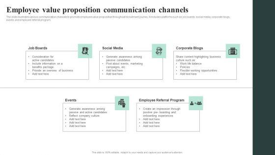 The slide illustrates various communication channels to promote employee value proposition throughout recruitment journey. It includes platforms such as job boards, social media, corporate blogs, events and employee referral program. Crafting an eye-catching presentation has never been more straightforward. Let your presentation shine with this tasteful yet straightforward Creating Employee Value Proposition Employee Value Proposition Communication Channels Download PDF template. It offers a minimalistic and classy look that is great for making a statement. The colors have been employed intelligently to add a bit of playfulness while still remaining professional. Construct the ideal Creating Employee Value Proposition Employee Value Proposition Communication Channels Download PDF that effortlessly grabs the attention of your audience Begin now and be certain to wow your customers.