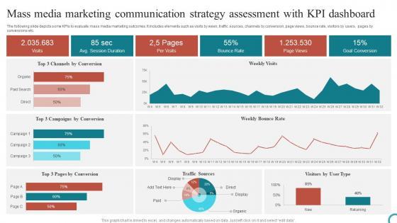 The following slide depicts some KPIs to evaluate mass media marketing outcomes. It includes elements such as visits by week, traffic sources, channels by conversion, page views, bounce rate, visitors by users, pages by conversions etc. Showcasing this set of slides titled Mass Media Marketing Communication Strategy Assessment With KPI Dashboard Elements Pdf. The topics addressed in these templates are Dashboard, Goal Conversion, Bounce Rate. All the content presented in this PPT design is completely editable. Download it and make adjustments in color, background, font etc. as per your unique business setting. The following slide depicts some KPIs to evaluate mass media marketing outcomes. It includes elements such as visits by week, traffic sources, channels by conversion, page views, bounce rate, visitors by users, pages by conversions etc.