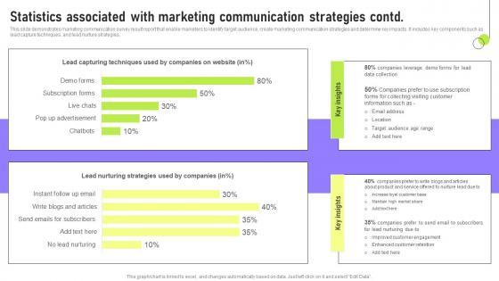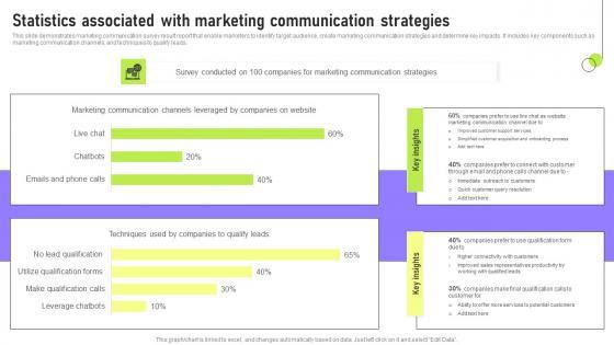 This slide demonstrates marketing communication survey result report that enable marketers to identify target audience, create marketing communication strategies and determine key impacts. It includes key components such as marketing communication channels, and techniques to qualify leads. Do you have to make sure that everyone on your team knows about any specific topic I yes, then you should give Statistics Associated With Marketing Communication Strategies Designs PDF a try. Our experts have put a lot of knowledge and effort into creating this impeccable Statistics Associated With Marketing Communication Strategies Designs PDF. You can use this template for your upcoming presentations, as the slides are perfect to represent even the tiniest detail. You can download these templates from the Slidegeeks website and these are easy to edit. So grab these today.