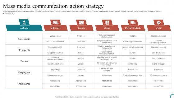 The following slide depicts the mass media communication plan to refine brands image. It also includes elements such as audience, deliverables, timeline, details, delivery methods, owner, customers, prospects, events, employees etc. Showcasing this set of slides titled Mass Media Communication Action Strategy Brochure Pdf. The topics addressed in these templates are Audience, Deliverable, Timeline. All the content presented in this PPT design is completely editable. Download it and make adjustments in color, background, font etc. as per your unique business setting. The following slide depicts the mass media communication plan to refine brands image. It also includes elements such as audience, deliverables, timeline, details, delivery methods, owner, customers, prospects, events, employees etc.