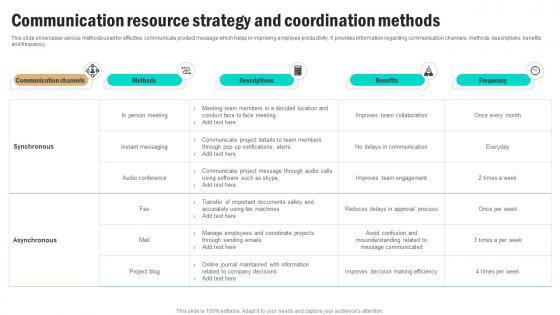 This slide showcases various methods used for effective communicate product message which helps in improving employee productivity. It provides information regarding communication channels, methods, descriptions, benefits and frequency. Showcasing this set of slides titled Communication Resource Strategy And Coordination Methods Brochure Pdf. The topics addressed in these templates are Communication Channels, Methods, Descriptions, Benefits And Frequency. All the content presented in this PPT design is completely editable. Download it and make adjustments in color, background, font etc. as per your unique business setting. This slide showcases various methods used for effective communicate product message which helps in improving employee productivity. It provides information regarding communication channels, methods, descriptions, benefits and frequency.