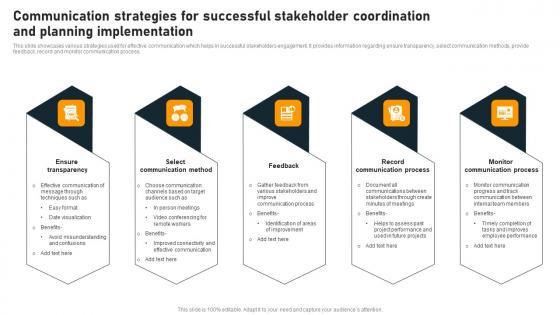 This slide showcases various strategies used for effective communication which helps in successful stakeholders engagement. It provides information regarding ensure transparency, select communication methods, provide feedback, record and monitor communication process. Pitch your topic with ease and precision using this Communication Strategies For Successful Stakeholder Coordination And Planning Implementation Sample Pdf. This layout presents information on Ensure Transparency, Feedback, Record Communication Process. It is also available for immediate download and adjustment. So, changes can be made in the color, design, graphics or any other component to create a unique layout. This slide showcases various strategies used for effective communication which helps in successful stakeholders engagement. It provides information regarding ensure transparency, select communication methods, provide feedback, record and monitor communication process.